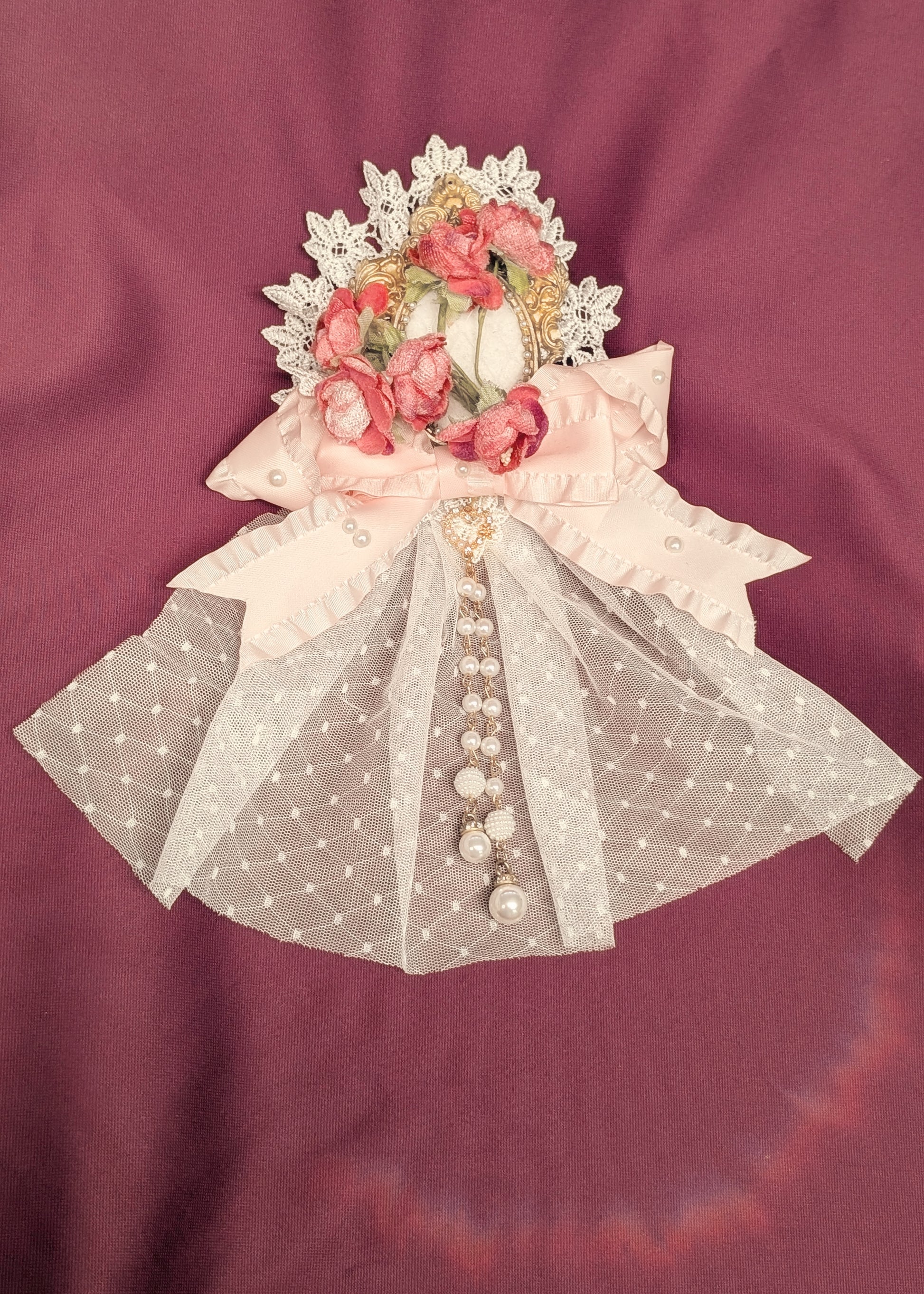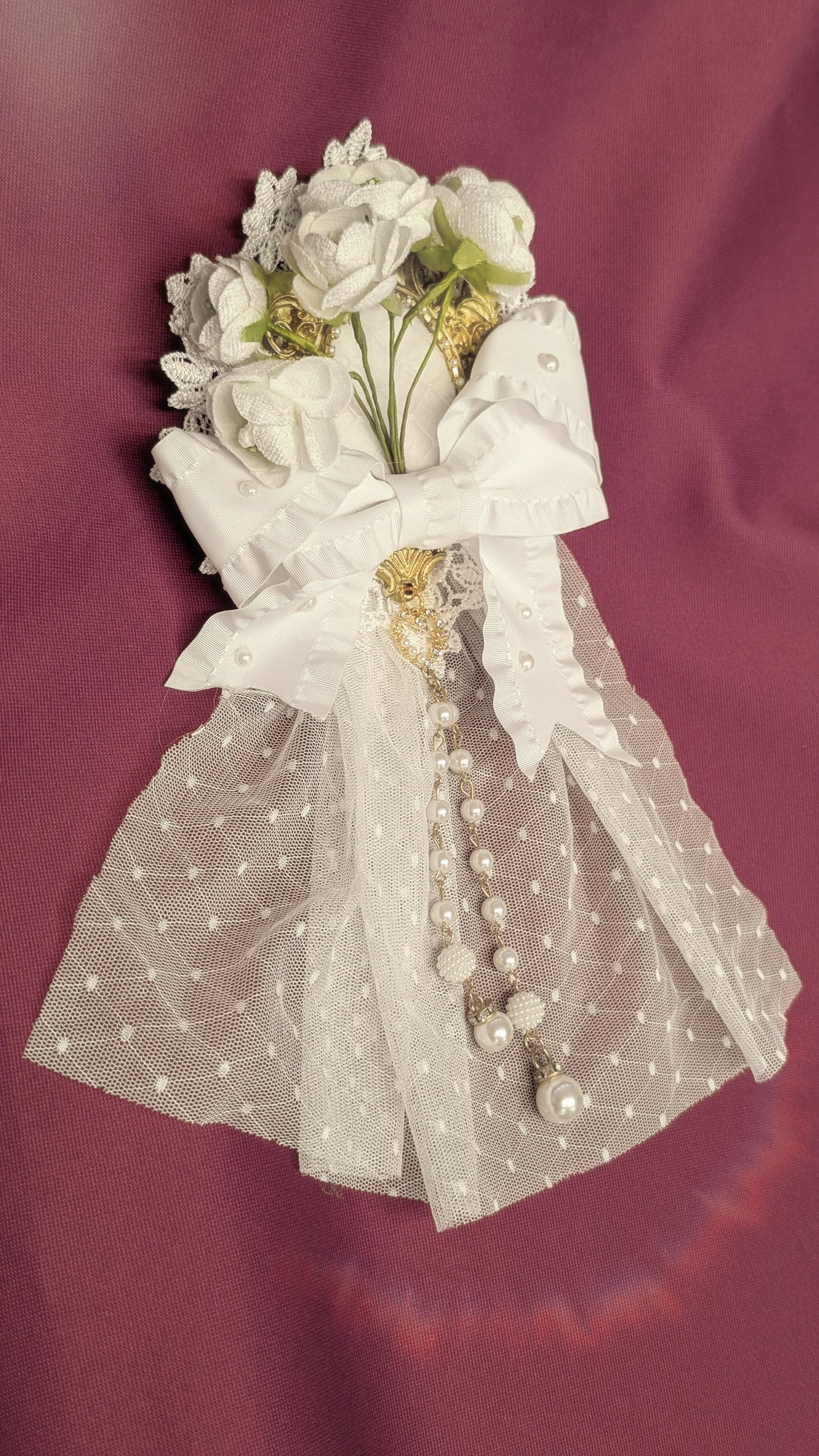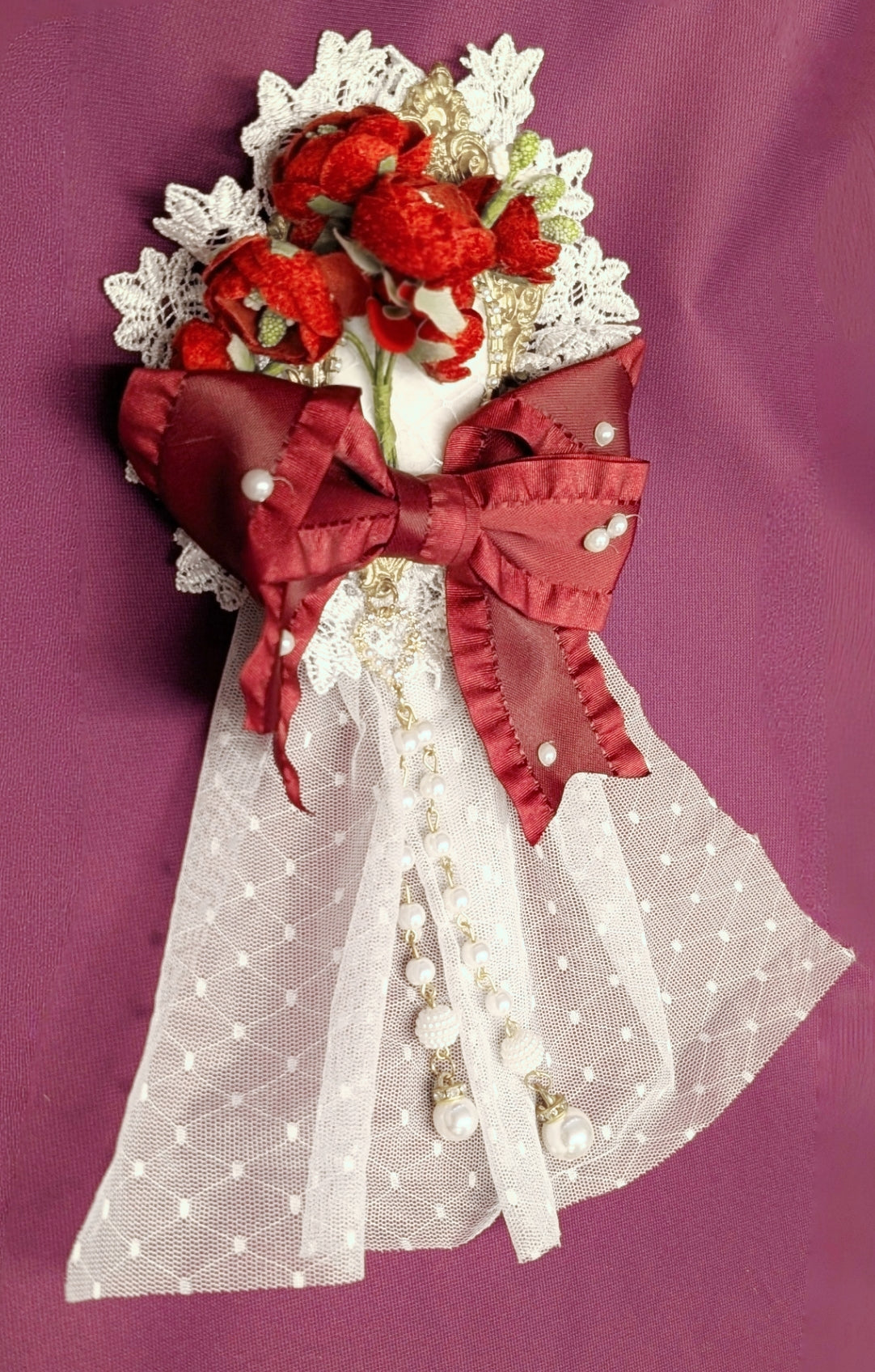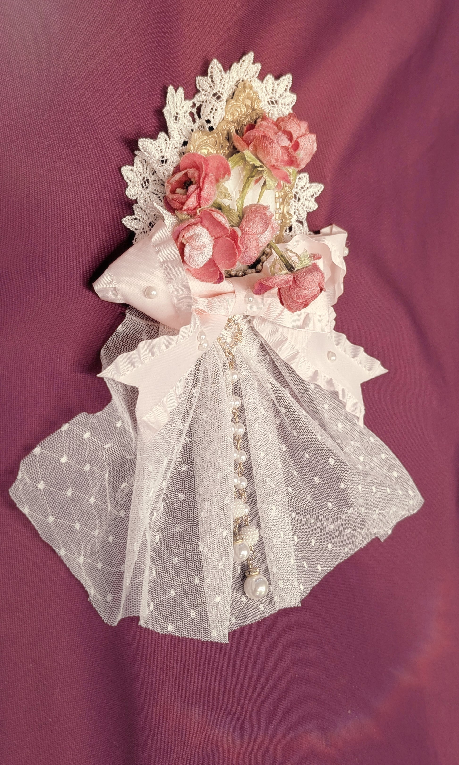 Elegante Blumenbrosche mit Spitze, Perlen und opulenten Schleifen, die jedem Outfit einen Hauch von romantischer Vintage-Eleganz verleihen.