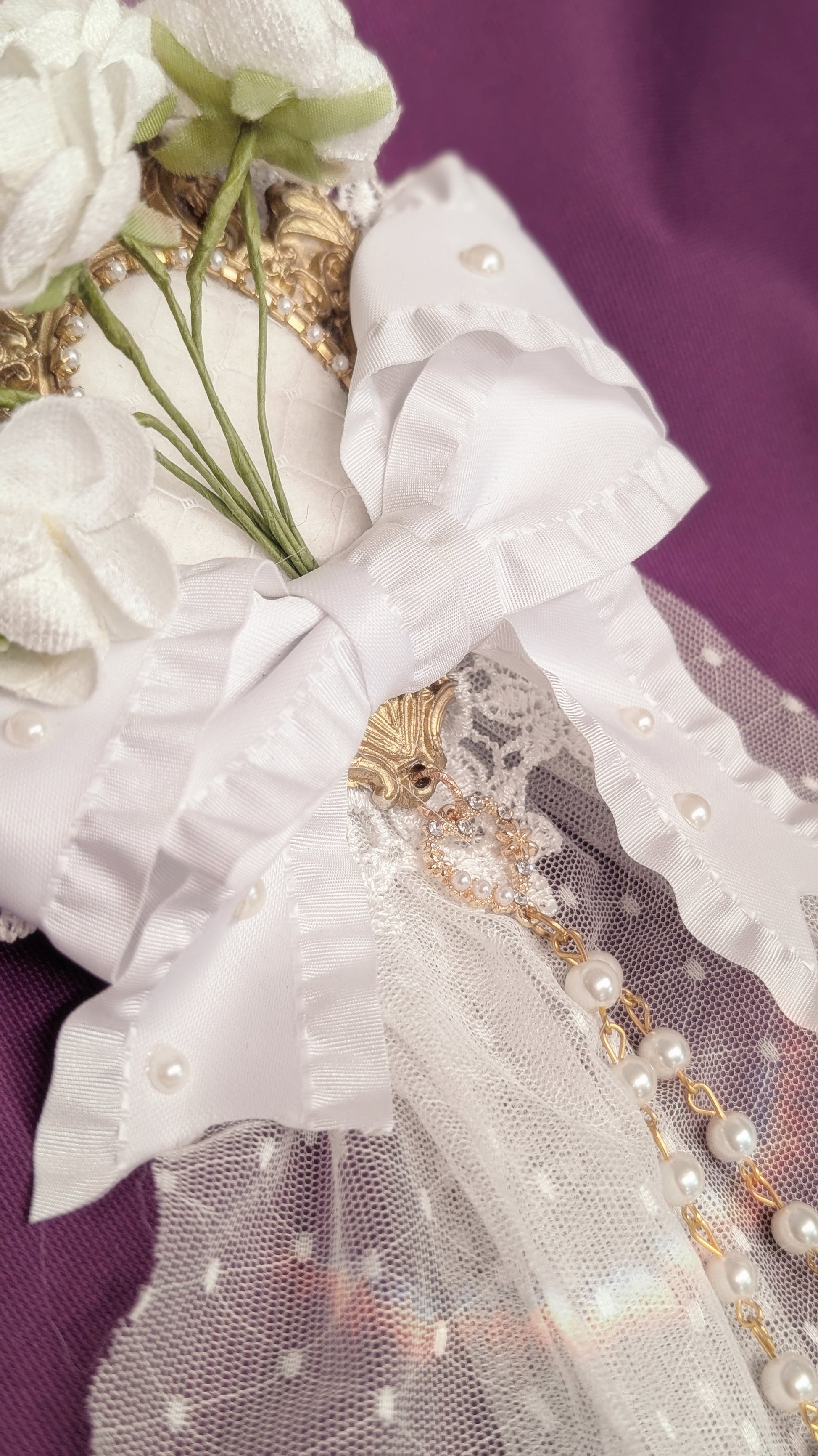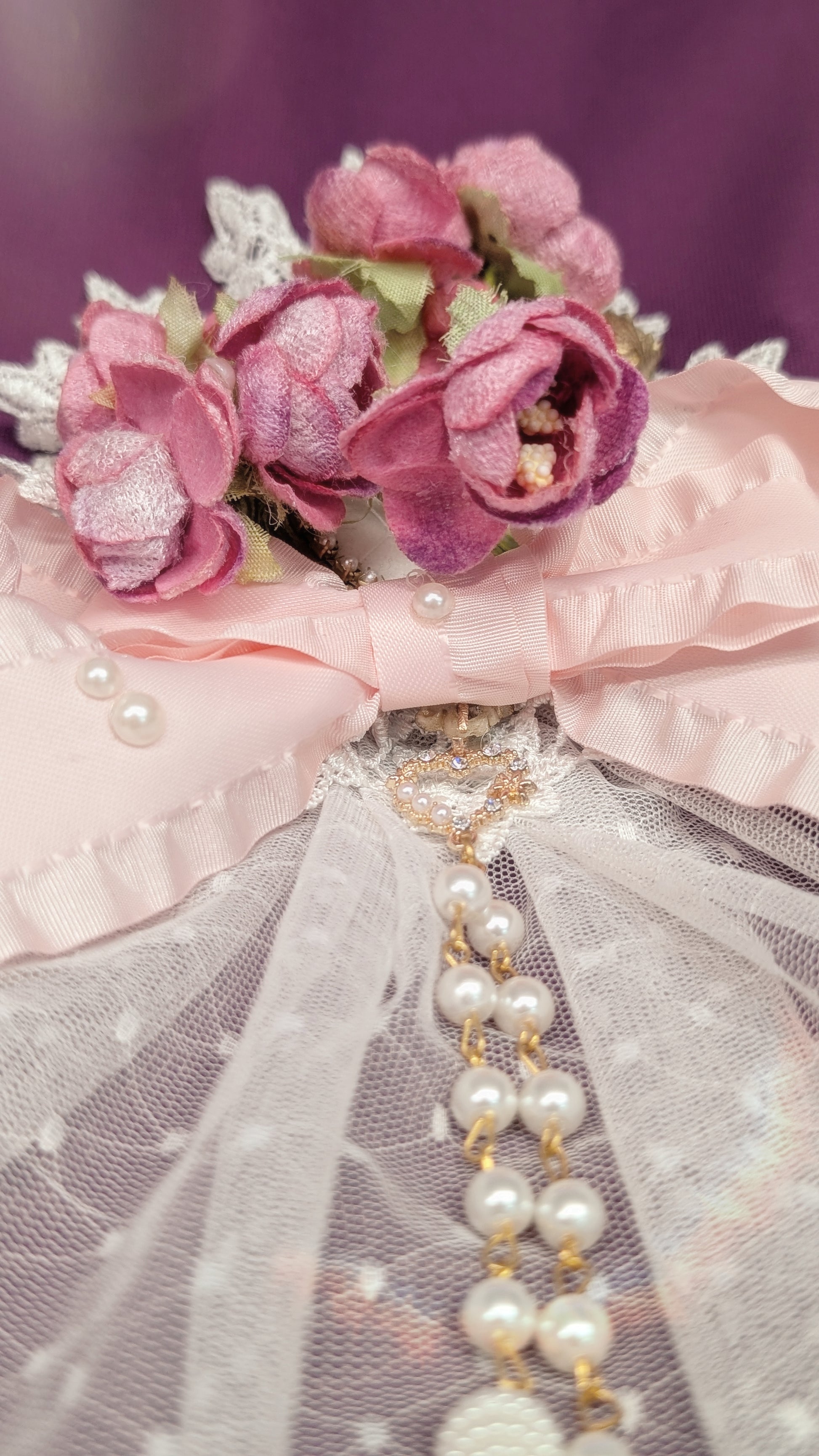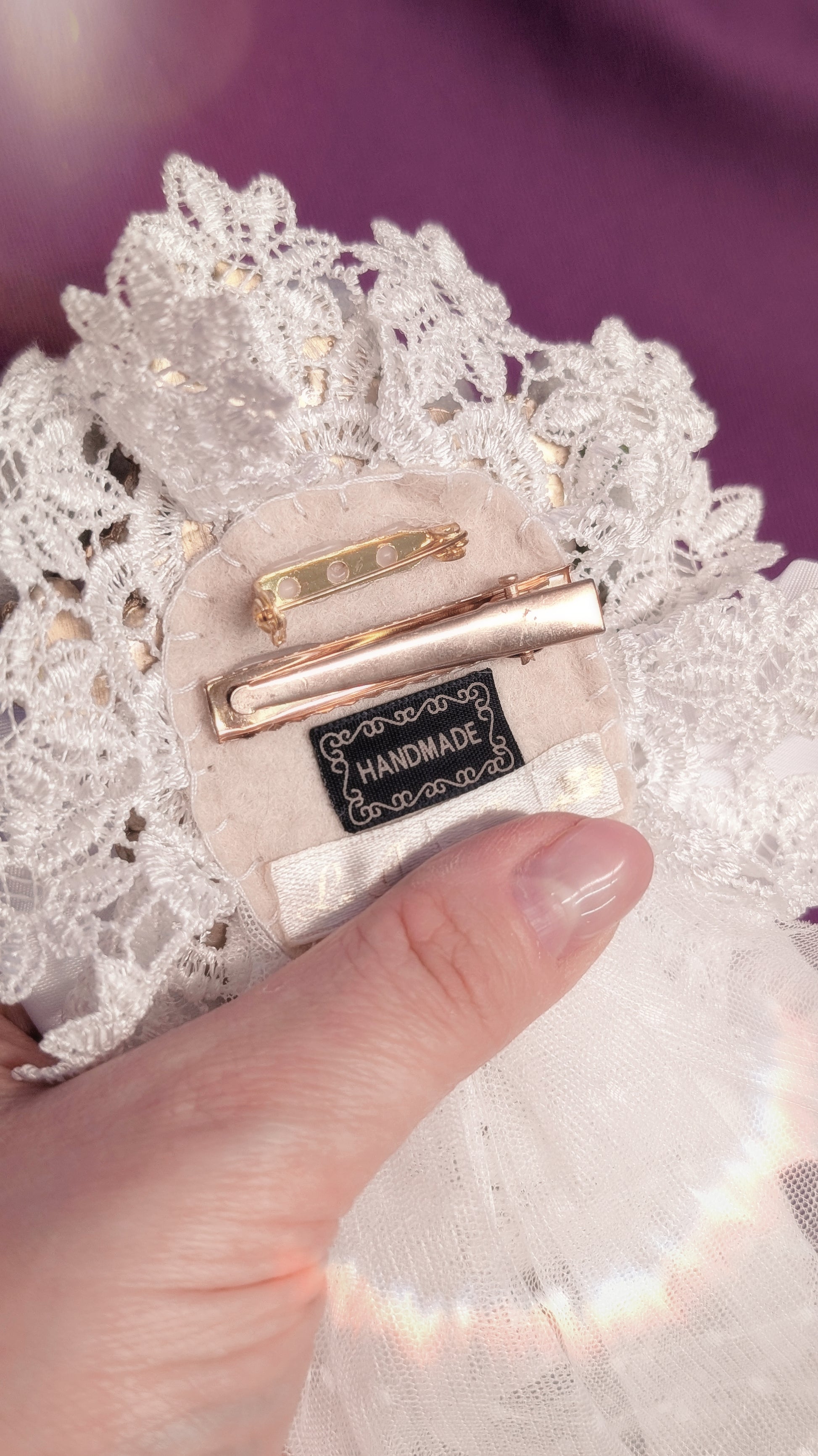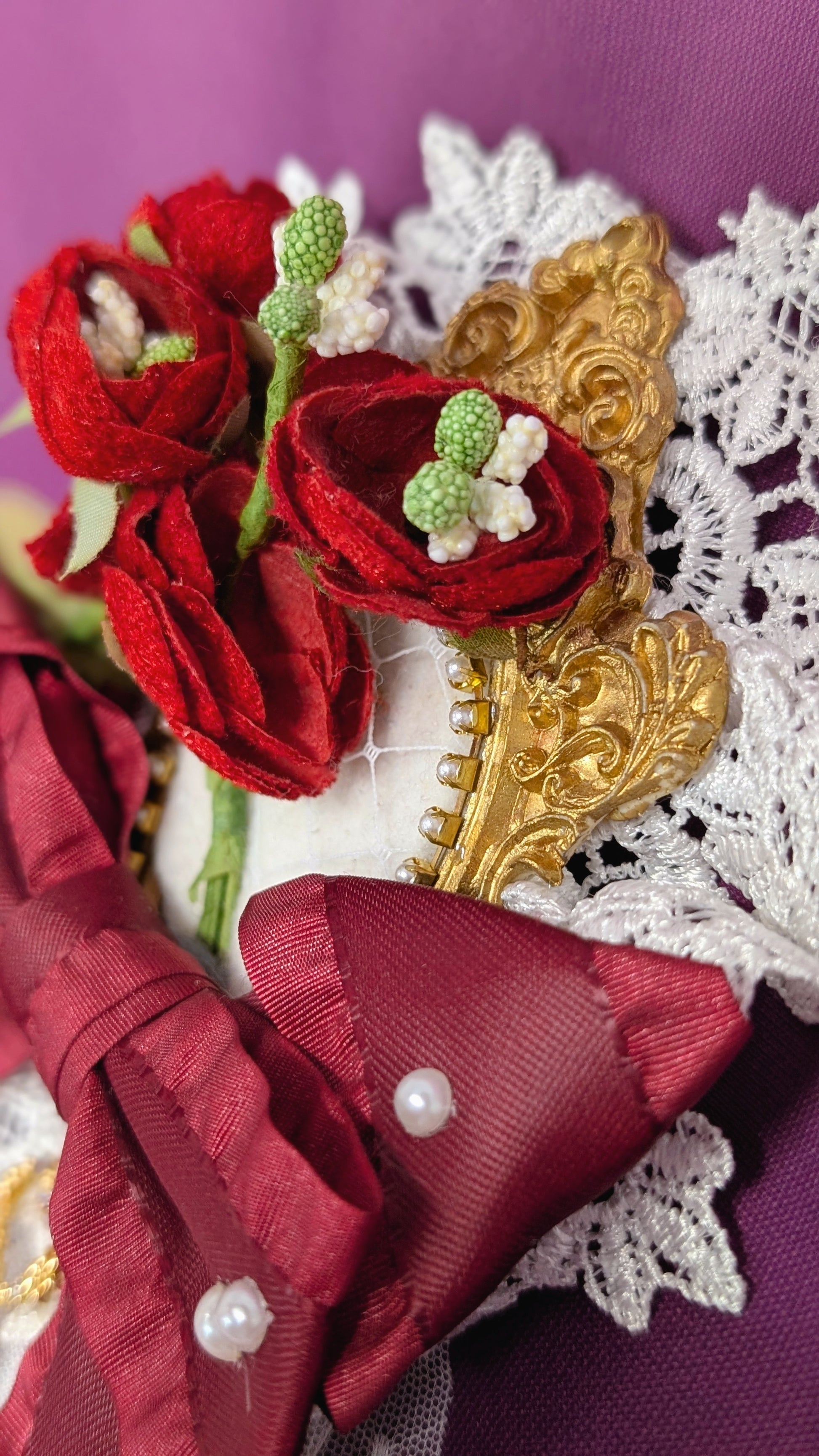 Elegante Blumenbrosche mit Spitze, Perlen und opulenten Schleifen, die jedem Outfit einen Hauch von romantischer Vintage-Eleganz verleihen.