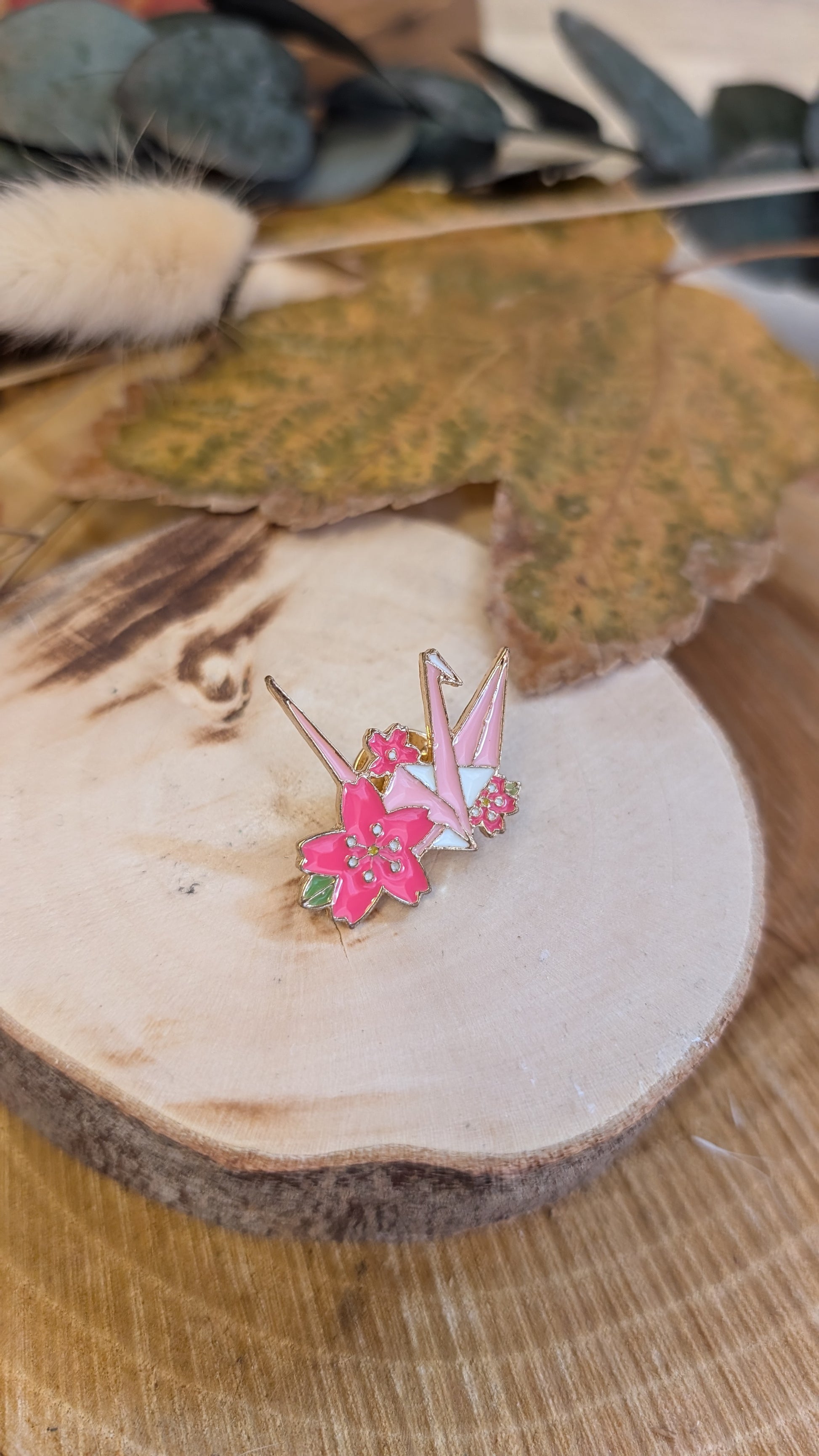 Dieser zarte Pin zeigt einen rosafarbenen Origami-Kranich, umgeben von passenden Blüten. Das filigrane Design verleiht jedem Outfit eine elegante und friedliche Note, inspiriert von der Kunst des Origami und der Symbolik des Kranichs als Glücksbringer. Perfekt für Liebhaber feiner Details und sanfter Farben!