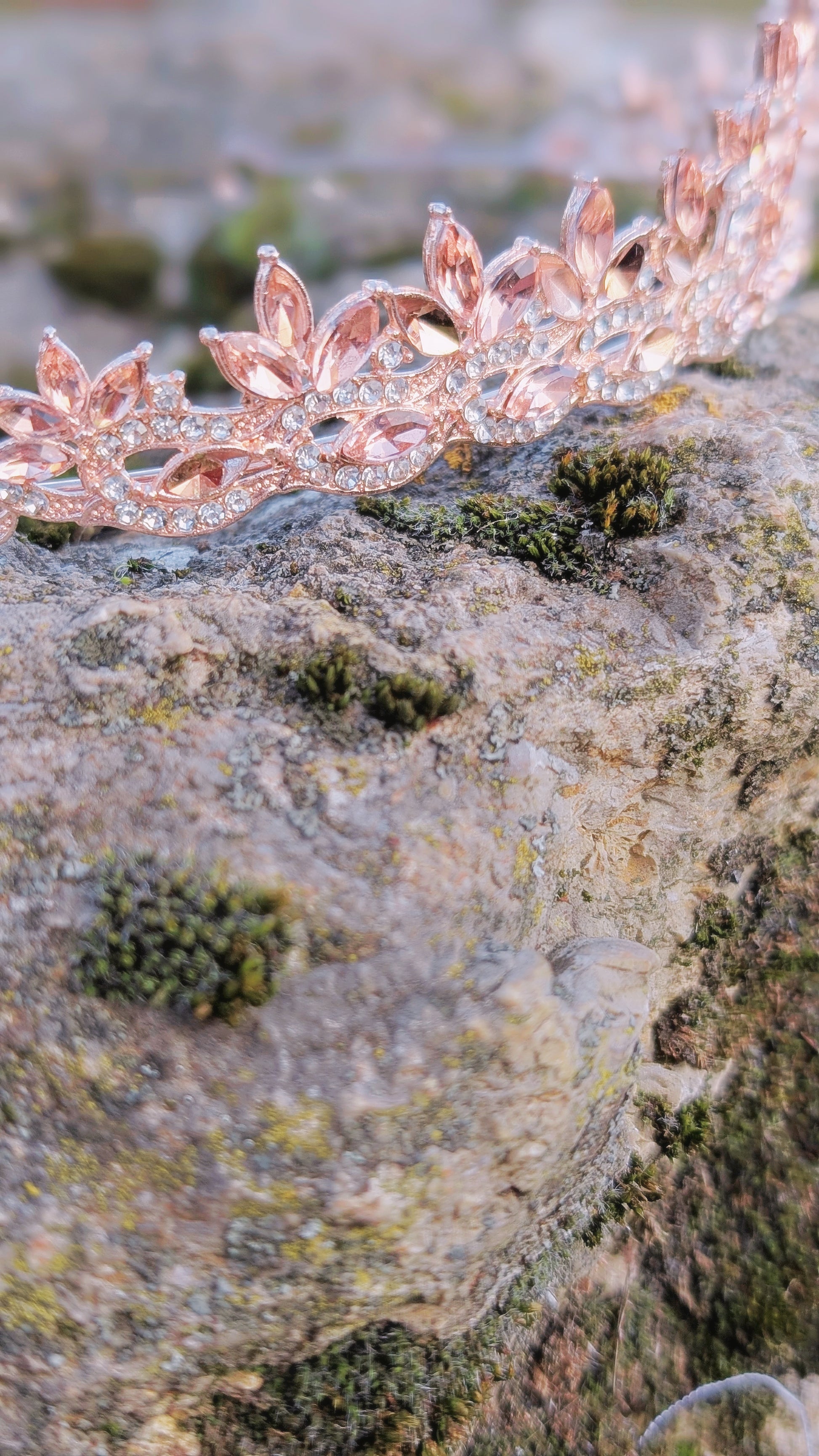 Zarte Tiara in Form von Rosa Kristallblüten in der Farben von Rosegold beschmückt mit funkelnden Steinen.